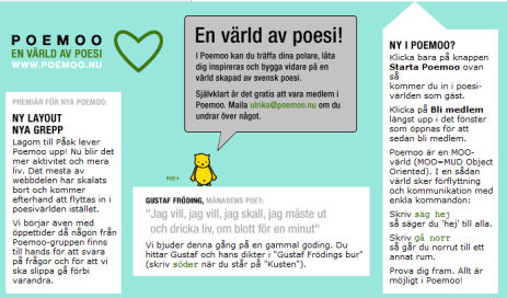 Det som började som ett studentprojekt fortsatte vidare i ett eget företag som vi kämpade tillsammans med under ett år. På stipendiepengar producerade vi en sexuundervisningsMoo för RFSU, vi hade gymnasie- och högstadielärare med egna klasser inne i Poemoo och vår tidigare rektor Göran Lange genomförde en hel tiopoängskurs i filosofi i en av våra MOOar, men jag kan fortfarande idag inte säga om vi var för tidiga eller för sena med våra världar. Gränssnittet var för knepigt för ovana datoranvändare och är det än idag, men jag är glad att vi utforskade det som vi gjorde och vi fick ovärderliga erfarenheter av sociala digitala platser.