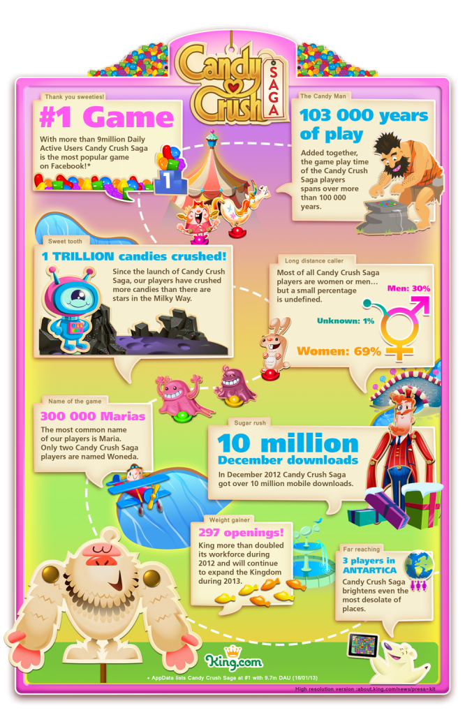 Även Candy Crush Saga har en huvudsaklig andel kvinnliga spelare och är just nu det största spelet på Facebook i alla kategorier. King.com hade redan innan deras facebooknärvaro kvinnor 50+ som sin huvudsakliga målgrupp. De lät användarna satsa småpengar på att de skulle vinna i ett enkelt casual game mot en anonym motståndare. Infographic finns på games.com med artikel. King.com har funnits sedan 2005.